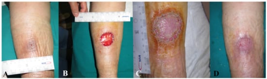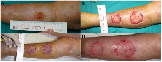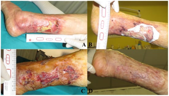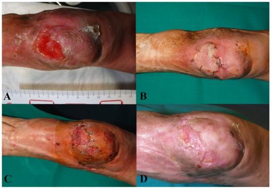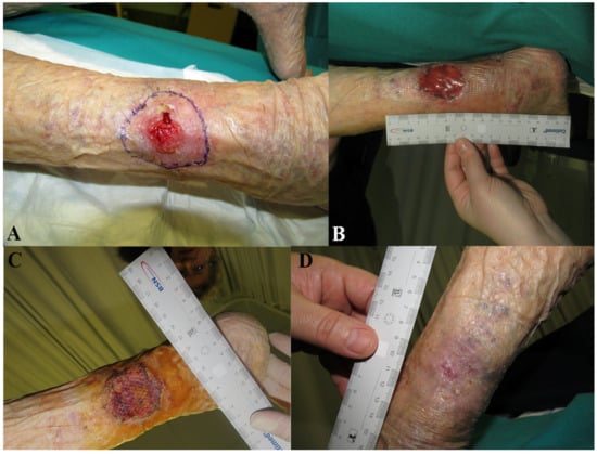 ®) illustrating the initial wound appearance (A), the dermal substitute applying (B), the skin graft take (C) and the final closure result at 30 days (D).