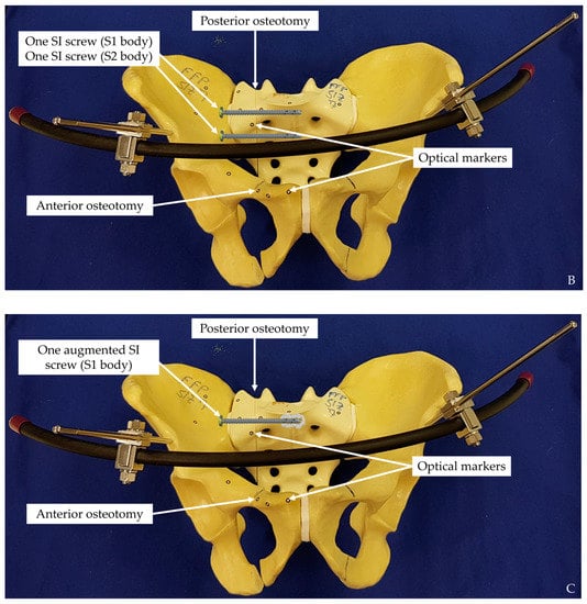 - Grüneweller, N.; Raschke, M.J.; Zderic, I.; Widmer, D.; Wähnert, D.; Gueorguiev, B.; Richards, R.G.; Fuchs, T.; Windolf, M. Biomechanical comparison of augmented versus non-augmented sacroiliac screws in a novel hemi-pelvis test model. J. Orthop. Res. 2017, 35, 1485–1493. [Google Scholar] [CrossRef]
