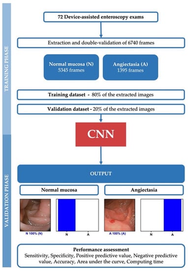 - Tsuboi, A.; Oka, S.; Aoyama, K.; Saito, H.; Aoki, T.; Yamada, A.; Matsuda, T.; Fujishiro, M.; Ishihara, S.; Nakahori, M.; et al. Artificial intelligence using a convolutional neural network for automatic detection of small-bowel angioectasia in capsule endoscopy images. Dig. Endosc. 2020, 32, 382–390. [Google Scholar] [CrossRef] [PubMed]