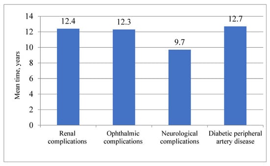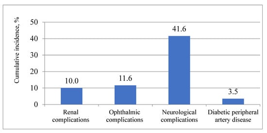 The results of this study demonstrate a high cumulative incidence of chronic microvascular complications and peripheral artery disease (PAD) in a cohort of newly diagnosed T2DM in middle-aged persons: almost half of them experienced at least 1 complication over the 13 years, more often men than women, and more frequently patients who were under 65 at the time of diagnosis of T2DM. On average, neurological T2DM complications occurred for the first time after 9 years and were the most common complications for the 13-year follow-up period. These affected more than 40% of patients, whereas all other examined complications developed less frequently and also later, about 12 years after the diabetes mellitus diagnosis: ophthalmological and renal complications were confirmed only in 10% of patients. PAD was the rarest complication and affected only 3% of the study population.