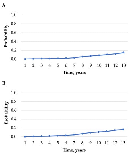 Linkeviciute-Ulinskiene D et al. have analyzed the excess risk of mortality among people with T2DM in Lithuania []. They found that people with T2DM had a higher mortality risk (standardized mortality ratio (SMR)= 1.35, (95% CI 1.34–1.37)), which was higher in women (SMR= 1.43 (95% CI 1.41–1.45)) than in men (SMR = 1.24 (95% CI 1.22–1.27)), in those who were diagnosed with T2DM at a younger age (SMR = 1.68, 95% (CI 1.60–1.76)) and had diabetes for a longer duration. The risk of mortality increased with increasing time since diabetes diagnosis, with SMRs of 1.09, 1.23, and 1.36 in periods 1–5, 6–10, and >10 years after diagnosis, respectively. According to our study results, at the end of the follow-up, the probability of death was higher in men (0.46) than in women (0.37), and also in those who were diagnosed with T2DM at an older age (0.64). We also determined that the probability of death had increased with increasing time since diabetes diagnosis (0.04 in the second year and 0.4 in the thirteenth year). Due to the different methodology used, the results of the studies cannot be directly compared. Though a retrospective cohort study design was used in both Lithuanian studies, but different T2DM cases were included into studies and different indices were analyzed. Only patients diagnosed at the age of 40 or older and patients who had more than 6 prescriptions for reimbursed glucose-lowering medications were included into the study performed by Linkeviciute-Ulinskiene D et al. The occurrence of complications was not taken into account. We analyzed T2DM cases diagnosed at age of 18 or older without complications at the time of diagnosis. Despite the differences, both studies showed an increase in the death probability or risk to die of diabetes with increasing time since diabetes diagnosis.