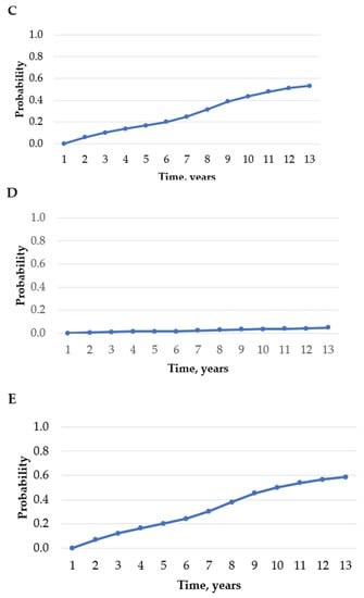 Probability of occurrence of renal complications among patients with T2DM (A). Probability of occurrence of ophthalmic complications among patients with T2DM (B). Probability of occurrence of neurological complications among patients with T2DM (C). Probability of occurrence of diabetic peripheral artery disease among patients with T2DM (D). Probability of occurrence of renal, ophthalmic, neurological complications and diabetic peripheral artery disease among patients with T2DM (E).