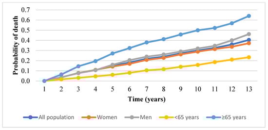 During the 13 years, 38.2% of the patients died. More men (43.1%) than women (35.5%) died during analysis period (p = 0.036). Mortality was higher among older patients (60.7%) than among younger patients (22.2%) (p < 0.001). Within the 13 years, 0.6% of the analyzed patients left the country.