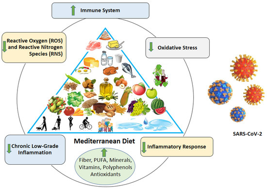 Currently, no specific data have been reported regarding the immunological response to SARS-CoV-2, but new studies have shown that a cytokine storm overstimulates the body’s immune response to microorganisms as a consequence of increases in the levels of inflammatory factors [12]. Therefore, the inflammatory factors contribute to one of the most important mechanisms underlying disease progression and death. Then, the coexistence of both COVID-19 and chronic diseases should be considered alarming, because it represents the combination of more pandemics [13]. The interaction between nutrition, immune function, inflammation, and infection represents a key tool to reduce the risk of susceptibility and morbidity of viral infectious diseases [13,14,15]. Research has shown that greater adherence to the Mediterranean diet (MetDiet) is associated with a reduced risk of major chronic diseases, [16] due to its anti-inflammatory and immune-modulatory properties. Thus, we hypothesize that the MetDiet could play a potentially beneficial role in people with SARS-CoV-2 infection.