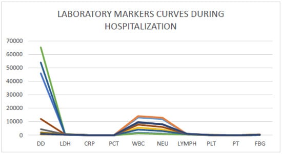 Laboratory markers curves during the hospitalization of reported patients. DD: d-dimer; LDH: lactate dehydrogenase; CRP: C reactive protein; PCT: procalcitonin; WBC: white blood cells; NEU: neutrophils; LYMPH: lymphocytes; PLT: platelets; PT: prothrombin time; FBG: fibrinogen.