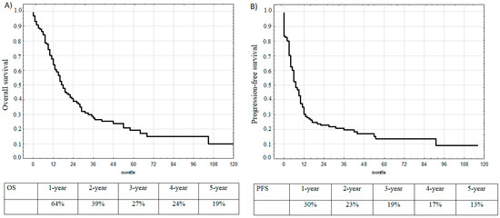 Nintey-seven patients died during the follow-up period. Five-year OS for all patients was 19%. The median overall survival (mOS) was 17 months (95% Confidence Interval (CI): 9.0–36.2 months; Figure 1A). Progression during the observation interval was documented in 107 cases. The median progression-free survival (mPFS) was 7 months (95% CI: 3.0–15.0 months), and 13% of patients survived 5 years without progression (Figure 1B).