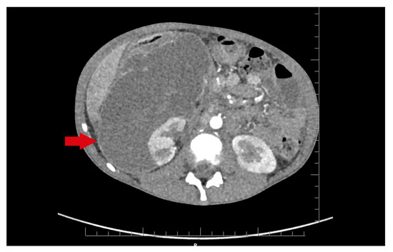 In the infectious disease ward, COVID-19 was excluded. During hospitalization, the patient developed acute abdominal symptoms. The acute condition of the boy appeared suddenly. Results of laboratory tests showed deviations in white blood cells (WBC) = 11.89 × 103/µL, and hemoglobin (HGB) = 6.9 g/dL, with hematocrit (HCT) = 20.6%. The inflammatory markers were elevated. Urinalysis showed 75 mg/dL of proteins. The ultrasound of the abdomen and computed tomography were performed. The diagnosis was unclear. Inflammation, abscess, cyst, and abdominal tumor were suggested. In the computed tomography (CT), the lesion had dimensions: 11.1 × 8.2 × 25 cm (Figure 1 and Figure 2).