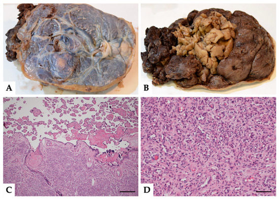 (A,B) Gross specimen of the placenta. Fetal surface (A) and maternal surface (B) with the gross appearance of the fleshy mass. (C,D) Histopathological findings of the placental chorioangioma. Panoramic view of abrupt transition between normal parenchyma and chorioangioma ((C) magnification 100×, scale bar 200 μm, hematoxylin and eosin, H&E). Particular of the chorioangioma at higher magnification: a network of small and medium-size vessels, lined by endothelium cells with inconspicuous nuclei and without atypia chorioangioma ((D) magnification 200×, scale bar 100 μm, H&E).