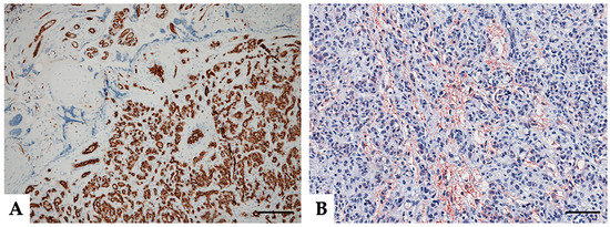 Endothelial cells were diffusely immunoreactive for CD31 (also named platelet endothelial adhesion molecule 1, PECAM-1) (clone JC70—Cell Marque, Rocklin, CA, USA) (Figure 2A). Placental villi showed a regular vascular pattern in their axis, only occasionally showing the crowded capillaries that are most often observed in chorioangiosis. Immunostaining for CD133 (clone D2V8Q—Cell Signaling Technology, Inc., Danvers, MA, USA) was performed in multiple samples obtained from chorioangioma and placental parenchyma (Figure 2B,C). Cells of the chorioangioma showed evident diffuse membranous and cytoplasmatic expression of CD133, differently from the villi that exhibited a focal pattern of staining (Figure 2D). In particular, CD133 was expressed in syncytiotrophoblast and trophoblast elements (Figure 2D–F).