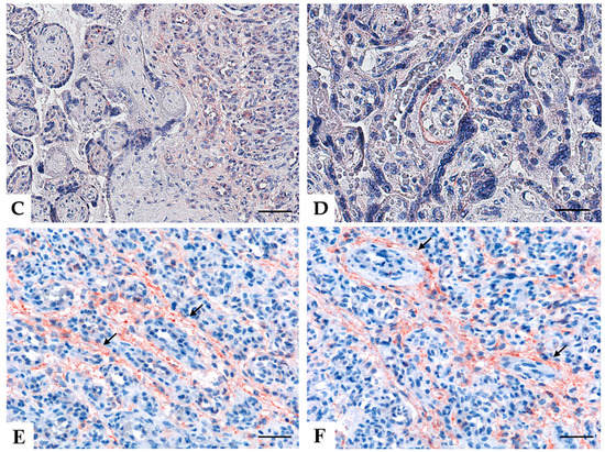 The pattern of immunohistochemical expression of CD31 and CD133 in placental chorioangioma. CD31 immunostaining showing vascular endothelium ((A) magnification 100×, scale bar 200 μm). Representative microphotographs relative to CD133 expression within tumoral contexture ((B) magnification 200×, scale bar 100 μm) and detailing the abrupt transition between the normal placenta and chorioangioma ((C) magnification 200×, scale bar 100 μm) and villi at higher magnification (black arrows) ((D–F) magnification 400×, scale bar 50 μm). Stains were revealed via DAB (3,3’-diaminobenzidine) or AEC (3-amino-9-ethylcarbazole, Dako, Denmark) substrate chromogen. Slides were counterstained with Harris Hematoxylin (Novocastra, Leica Biosystems).