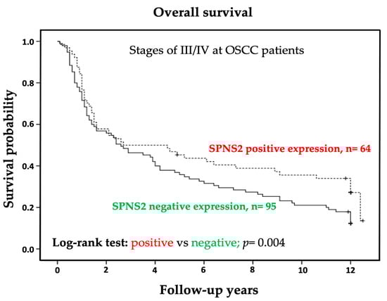 We examined the correlation between cytoplasmic SPNS2 protein expression and overall survival of patients with OSCC stage III/IV using the Kaplan–Meier method and log-rank test to plot survival curves. Our results indicated that the overall survival time of the 95 OSCC stage III/IV patients who tested negative for SPNS2 protein expression was shorter than that of the 64 patients who tested positive (p = 0.004) (Figure 2).