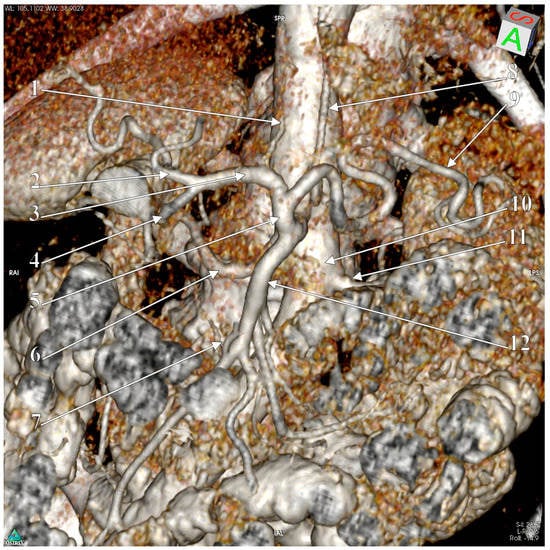 3D-VR of the hepatosplenomesentericophrenic trunk. 1. Right inferior phrenic a. (artery); 2. proper hepatic a.; 3. common hepatic a.; 4. gastroduodenal a.; 5. hepatosplenic trunk; 6. right renal a.; 7. middle colic a.; 8. left gastric a.; 9. splenic a.; 10. abdominal aorta; 11. left renal a.; 12. superior mesenteric a.