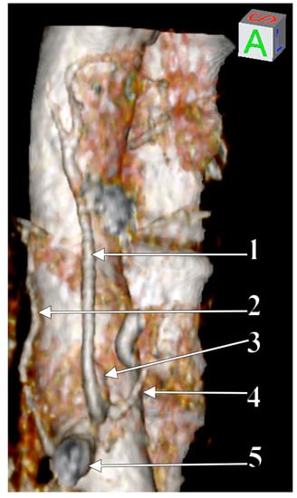 During a retrospective study of archived computed tomography angiograms, the variant reported here was found in a 72-year-old female’s anonymized file. Informed consent for anonymous use of the data with scientific purposes was signed by the patient. The manuscript was tacitly approved by the responsible authorities where the work was carried out. The computed tomography examination used a previously detailed protocol [13,14]. It used a 32-slice scanner (Siemens Multislice Perspective Scanner, Erlangen, Germany) with a 0.6 mm collimation and reconstruction of 0.75 mm thickness. The arterial variant was documented using the Horos software.