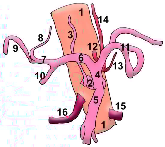 - Panagouli, E.; Venieratos, D.; Lolis, E.; Skandalakis, P. Variations in the anatomy of the celiac trunk: A systematic review and clinical implications. Ann. Anat. Anat. Anz. 2013, 195, 501–511. [Google Scholar] [CrossRef] [PubMed]