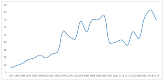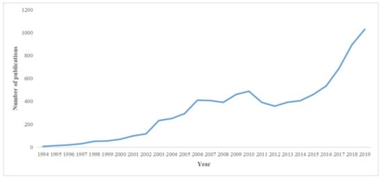 In this bibliometric analysis, 8539 ERAS-related studies were identified for the period 1994−2019, with the annual global publication showing significant growth since 2014. This condition might be affected by various guidelines published by the ERAS Society in recent years [,,,,,,,,,,,,,,,,,,,,,,,,]. Eighteen languages were published in ERAS-related studies. With the exception of Korean and Japanese, other languages are typically used in European countries. English is the dominant language for academic communication, accounting for the largest proportion (95.5%).