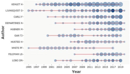 The result from the top 10 most productive authors shows anesthesiologists and surgeons to be predominant in ERAS programs [,,,]. Increasing attention should be paid to the role of nurses and physiotherapists in multidisciplinary work in the future to improve patient outcomes [,,]. Henrik Kehlet is the most relevant and academic influential author in ERAS. Olle Ljungqvist, the chairman of the ERAS society, ranked second. In addition, Henrik Kehlet was also the top active author in this area, contributing research papers commencing annually in 1997 (Figure 3).