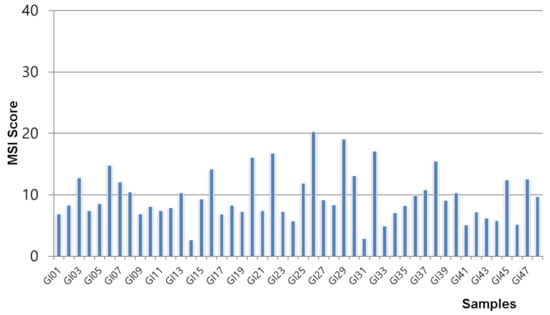 The genomic DNA was subjected to MSI panel sequencing using an Ion AmpliSeq Microsatellite Instability Assay (ThermoFisher Scientific, Waltham, MA, USA) consisting of a single primer pool, which amplified a total of 76 amplicons to assess the MSI status, as per the manufacturer’s protocol. The libraries for the MSI panel were partially phosphorylated using the FuPa reagent, ligated to different barcode adapters using an Ion Xpress Barcode Adapter 1–48 Kit (ThermoFisher Scientific, Waltham, MA, USA), and purified. The purified libraries were quantified using an Ion Library TaqMan Quantitation Kit (Thermo Fisher Scientific, Waltham, MA, USA). The pooled purified libraries of ten multiplexed tumor DNAs per Ion 318 v2 chip (ThermoFisher Scientific, Waltham, MA, USA) at a concentration of 50 pM were used for chip loading onto an Ion Chef with an Ion PGM Hi-Q Chef Kit (ThermoFisher Scientific, Waltham, MA, USA), and were subsequently sequenced on an Ion Torrent Personal Genome Machine (PGM) using an Ion PGM Hi-Q Sequencing Kit (ThermoFisher Scientific, Waltham, MA, USA). Control DNA of the CEPH was included in the same sequencing run. MSICall, an Ion Torrent Suite software plugin, was used to determine the target sites and to estimate the MSI score of each marker generated from the Ion AmpliSeq Microsatellite Instability Assay. Markers with over 30 mapped and filtered reads were considered to stand for the MSI score. Markers with scores less than 0.5, the marker score threshold, were filtered in to calculate the marker scores and MSI status of each sample, which were interpreted as follows: high MSI, MSI score ≥ 40; microsatellite stable (MSS), <40.