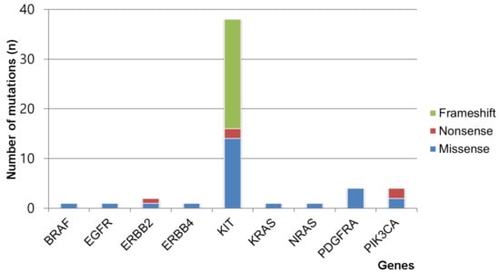 On the other hand, most of the GISTs were related to the spontaneous activation of BRAF, KIT, or PDGFRA mutations, along with additional genetic lesions of NF1, as well as components of the succinate dehydrogenase enzymatic complex [,]. GISTs commonly carry activated mutations of KIT or PDGFRA genes, and respond strongly to several selective tyrosine kinase inhibitors [,]. However, wild-type GISTs harbor no mutations of the KIT or PDGFRA genes, but KIT activation through phosphorylation was still identifiable in these tumors. These could be classified into two groups, according to whether they were deficient or proficient in the succinate dehydrogenase complex. The determination of activated mutations is required to subclassify wild-type GISTs in alternative pathways. To date, optimal systemic therapy for metastatic wild-type GISTs and adjuvant therapy in “high-risk” wild-type GISTs remains questionable, and has no precise guidelines []. Consequently, routine genetic mutation profiling could be considered as a crucial issue in the treatment of GISTs when undergoing tyrosine kinase inhibitor therapy []. For instance, patients with the exon 11 deletion of the KIT mutations profited from longer durations of adjuvant imatinib. The duration of adjuvant imatinib treatment changed the risk of GIST relapse related to some KIT mutations, such as deletions that affected exon 11 codons 557 and/or 558 []. Moreover, the achievement of secondary mutations in either KIT or PDGFRA revealed the most common mechanism of imatinib resistance in GISTs []. Similarly to our previous study [], this study also confirmed the usefulness of targeted NGS with a cancer gene panel for efficiently detecting somatic mutations related to GISTs.