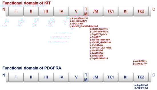 - Joensuu, H.; Wardelmann, E.; Sihto, H.; Eriksson, M.; Hall, K.S.; Reichardt, A.; Hartmann, J.T.; Pink, D.; Cameron, S.; Hohenberger, P.; et al. Effect of KIT and PDGFRA Mutations on Survival in Patients With Gastrointestinal Stromal Tumors Treated With Adjuvant Imatinib: An Exploratory Analysis of a Randomized Clinical Trial. JAMA Oncol. 2017, 3, 602–609. [Google Scholar] [CrossRef]