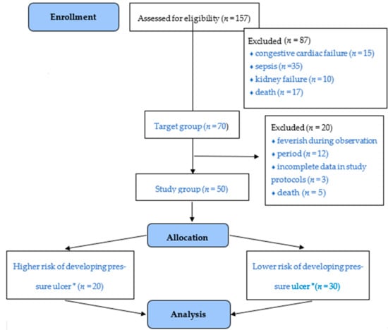 | Parameter | Lower vs. Higher Risk of Developing Pressure Ulcers | ||||