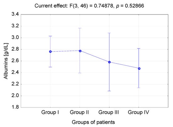 | Albumins | 2.96 ± 0.49 | 2.48 ± 0.6 | 0.88 (0.64–1.12) | 8.98 | 0.004 * |