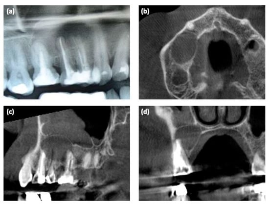 The dental X-ray showed the presence of a large cystic lesion related to teeth #14–16, which previously had been endodontically treated (Figure 1a). Thus, to evaluate the 3D dimensions of the lesion, cone-beam computed tomography (CBCT) with a multiplanar reconstruction program was used. The CBCT showed a periapical lesion of approximately 20 × 15 × 14 mm, with a soft, fluctuant, and cystic consistency, resulting in a critical-size alveolar bone defect [,] (Figure 1b–d).