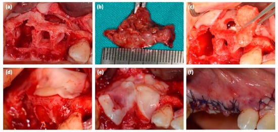 (a) bone defect after dental extractions and cyst removal; (b) cystic lesion; (c) the application of L-PRF clot under the sinus floor and L-PRF block in the bone lesion and post-extraction sockets; (d,e) the application of the remaining L-PRF clots over the surgical site; (f) sutures.