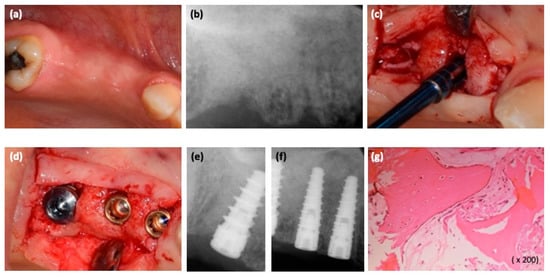 (a,b) Six months post-surgical regeneration procedures, clinical and radiological view; (c) bone sample harvesting procedure at the #15 implant site using a trephine bur; (d) dental implant placement; (e,f) intraoral radiograph after placing dental implants; (g) the magnification of histological findings of the bone sample (osteoblastic cells on the surface of the new woven bone containing osteocytes).