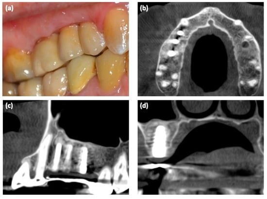Radiological examinations. (a) Detail of the dental X-ray at the first clinical examination; (b–d) 3D CBCT scan before surgery.
