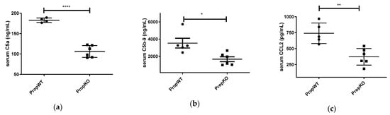 Serum levels of properdin- deficient (PropKO) and wildtype (PropWT) tumour-bearing mice for levels of C5a (a), C5b-9 (b), and CCL2 (c). Data are presented as means ± SEM. Two tailed t-tests were performed, * p < 0.05, ** p < 0.01, **** p < 0.0001.