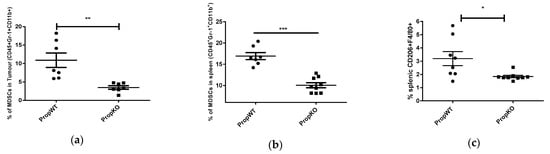 CD45+ CD11b+ Gr-1+ population in tumours and spleens and CD206+F4/80+ population in spleens from properdin-deficient (PropKO) and wildtype (PropWT) mice. Tumour cell suspensions were analysed for the proportion of CD45+ CD11b+ Gr-1+ cells (a) and splenic suspensions for the proportions of CD45+ CD11b+ Gr-1+ cells (b) and of CD206+F4/80+ cells (c). The data are presented as means ± SEM. Statistical analysis was performed by unpaired t-test. * p < 0.05, ** p < 0.01, *** p < 0.001.