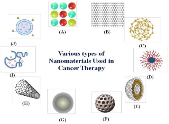 Various types of nanomaterials used in cancer therapy: (A) quantum dots, (B) graphene, (C) gold nanoparticles, (D) polymeric micelles, (E) liposomes, (F) silica nanoparticles, (G) magnetic nanoparticles, (H) carbon nanotubes, (I) polymer-drug conjugates, and (J) polymeric nanoparticles.