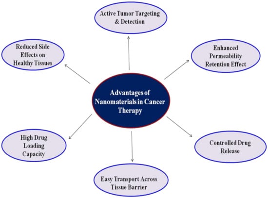 Great efforts have been employed to develop a different class of nanocarriers that can not only function as a cancer diagnostic agent but also inhibits therapeutic behavior [42]. Due to their small size, nanocarriers have higher permeability and retention, which shows more specificity and decreases the side effects of drugs, thus improving cancer treatment efficiency. Nanomaterials have a high surface to volume ratio, which is very useful to load a large amount of drug. Moreover, the high surface area of nanoparticles would allow co-loading of two or more types of therapeutic and diagnostic agents for synergistic therapy, such as photothermal therapy (PTT) and magnetic resonance imaging (MRI). This would efficiently improve therapeutic efficacy, and it will effectively avoid drug resistance due to monotherapy. In the last few decades, the use of nanomaterials in cancer therapy added some advantages and improved its therapeutic potency (Figure 2).