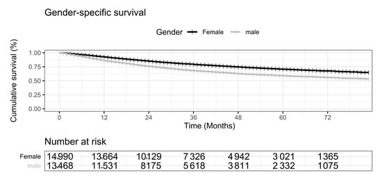 Inherent genetic factors and living environments induce apparent gender-specific biological mechanisms and prognostic responses []. Non-small cell lung cancers (NSCLC) patients demonstrate large gender-specific survival differences []. Zang et al. suggested that the gender variation cannot be explained by the differences in the factors of baseline exposure, smoking history, or body size, but may be caused by the higher susceptibility to tobacco carcinogens in females []. That is to say, females are more susceptible to tobacco-induced carcinogenesis than males []. Gasperino’s study showed that after taking into account the number of cigarettes smoked, females have a three-times higher risk of lung cancer than males []. Another study suggested that females have a better survival rate than males after considering confounders like smoking []. Many studies observed the gender differences in urothelial carcinoma of the bladder (UCB), where males had a higher incidence of UCB, but females tended to have worse outcomes []. Gender was also found to be a risk factor for the prognosis of head and neck cancer (HNC), and females had a better prognosis than males []. So, the gender specificity of lung cancers is attracting more researchers to work on this interesting topic.