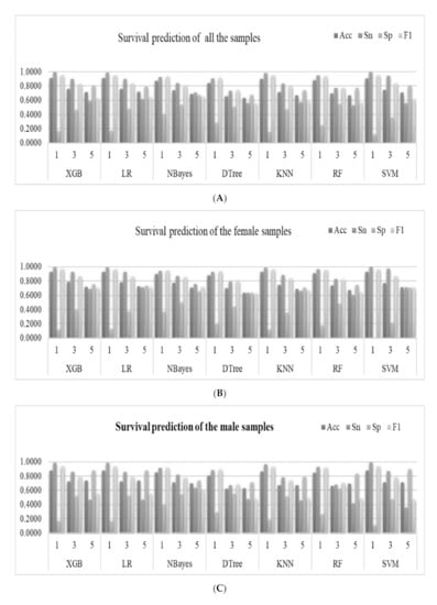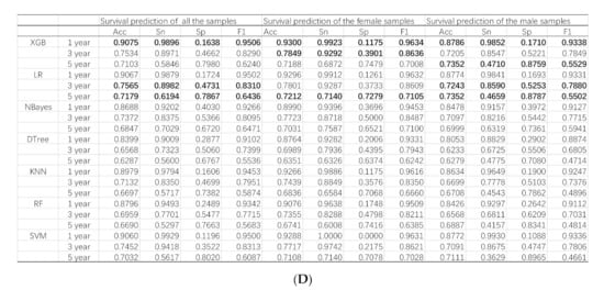 The machine learning models performed slightly differently on the gender-specific datasets, as shown in Figure 3B,C. The classifier XGB achieved the highest Acc = 0.8786 for the one-year survival prediction problem for the male samples. Similar to the above, the classifier LR achieved the highest Acc for the three- (Acc = 0.7243) and five-year (Acc = 0.7352) survival prediction problems, as shown in Figure 3C. The classifier XGB achieved the highest Acc for the one- (Acc = 0.9300) and three-year (Acc = 0.0.7849) survival prediction problems. Similarly, the classifier LR achieved the highest Acc for the five-year (Acc = 0.7212) survival prediction problems, as shown in Figure 3B.