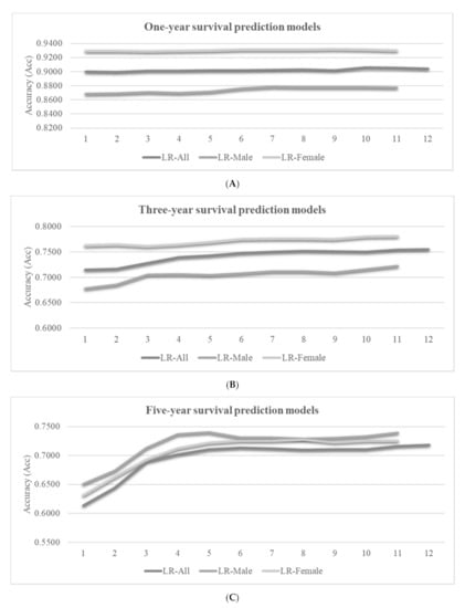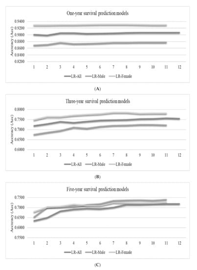 We may observe the overall trend that more features may achieve better prediction accuracies, as shown in Figure 5. However, the inclusions of some features may decrease the model performance in some cases. For example, the best LR-Female model achieved Acc = 0.9309 using only six features, and the model accuracy was decreased to Acc = 0.9296 by using five more features. The survival prediction model usually achieved a very good prediction accuracy using about six features, and the inclusions of more features only achieve minor accuracy improvements.
