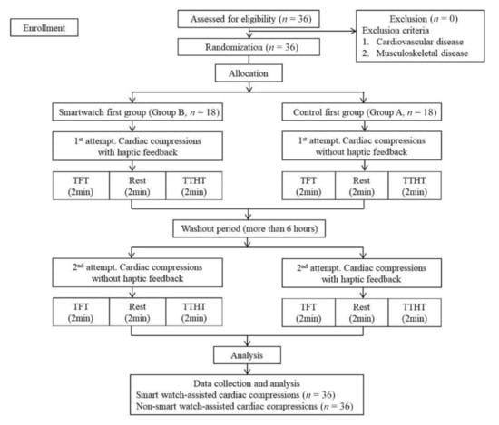All study participants were provided an introduction to the study protocol and the optimal cardiac compression for CPR suggested by the AHA guidelines that lasted for 10 min. At the first visit, the participants were randomly allocated to two groups: control first group (Group A, n = 18) and the smartwatch first group (Group B, n = 18). Each session consisted of 2 min of CCs using TFT, 2 min of rest, and 2 min of CCs using the TTHT. All participants performed hands-only CPR according to the AHA guideline.