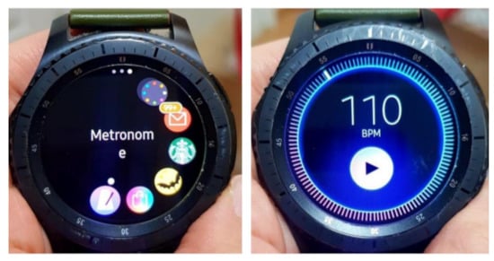 The smartwatch application is set to 110 BPM. BPM, beats per minute.