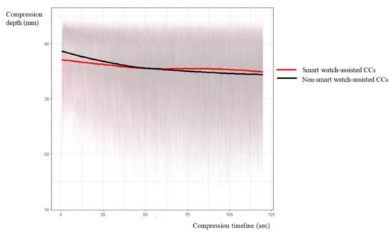 Comparison of the timeline graphs of compression depth between smart watch-assisted CCs and non-smartwatch-assisted CCs. CC, chest compression.