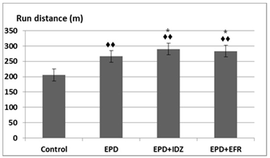 The effort test—the effects of ephedrine + idazoxan (EPD + IDZ) combination, respectively efaroxan (EFR), on the run distance in the treadmill test. Each value corresponds to the mean ± SD of run distance for 6 animals (♦♦ p < 0.01 vs. Control; * p < 0.05 vs. EPD group).