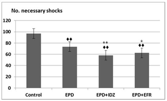 The effort test—the effects of EPD + IDZ combination, respectively EFR, on the number of necessary electric shocks applied to the animals to keep running on the belt in the treadmill test. Each value corresponds to the mean ± SD of applied shocks number for 6 animals (♦♦ p < 0.01 vs. Control; * p < 0.05, ** p < 0.01 vs. EPD group).