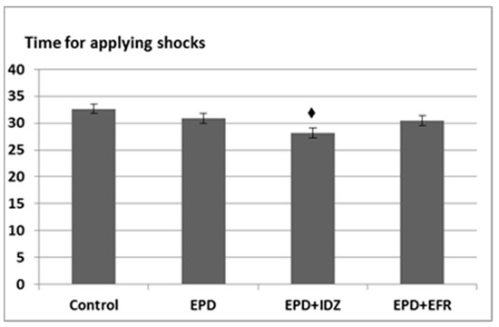 The treatment with EPD + IDZ induced a decrease in the interval of time for applying electric stimulation (28.17 ± 2.32 s), statistically significant compared to the Control group. The administration of EPD + EFR resulted in a slight diminution (30.50 ± 2.74 s) of the time period for applying the electric shocks, but non-significant compared to the Control group (Figure 3).