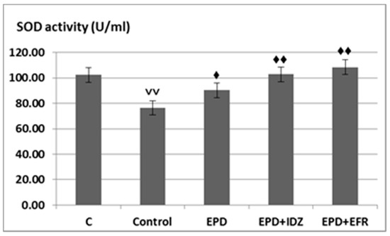 The effects of EPD + IDZ combination, respectively EFR on the SOD activity. Each value corresponds to the mean ± SD of SOD levels for 6 animals (♦ p < 0.05, ♦♦ p < 0.01 vs. Control group; ˅˅ p < 0.01 vs. Control group).