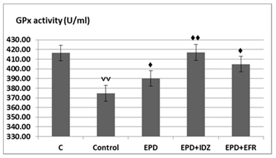 The effects of EPD + IDZ combination, respectively EFR on the GPx activity. Each value corresponds to the mean ± SD of GPx levels for 6 animals (♦ p < 0.05, ♦♦ p < 0.01 vs. Control; ˅˅ p < 0.01 vs. C group).