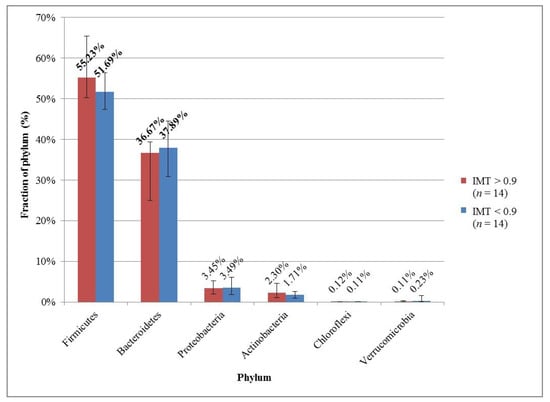 The human gut microbiota is mostly composed of two dominant bacterial phyla, Firmicutes and Bacteroidetes, which represent more than 90% of the total community, and of other subdominant phyla including Proteobacteria, Actinobacteria, and Verrucomicrobia [,]. This composition remains relatively unaffected by acute perturbations, as its plasticity allows it to rapidly return to its initial composition []. We could confirm this finding, as the most common phyla were the same in the group with normal IMT and very similar in the other group: Firmicutes, Bacteroidetes, Proteobacteria, Actinobacteria, and Verrucomicrobia vs. Chloroflexi. However, in their individual proportions, differences could be found: in line with the previous hypothesis of Firmicutes/Bacteroidetes ratio, Firmicutes was represented with a higher fraction in the group with high IMT values, and Bacteroidetes vice versa.