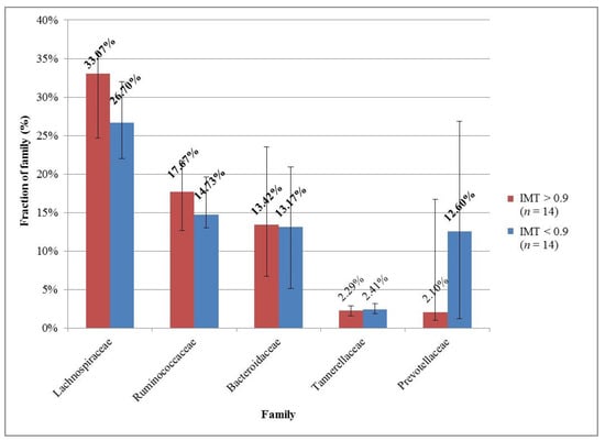 At the family taxonomic level, in both groups, Lachnospiraceae, Ruminococcaceae, and Bacteroidaceae were in the top 3 (Figure 2). In the group with normal IMT values, a substantially higher fraction of Prevotellaceae could be observed compared to the group with high IMT values.