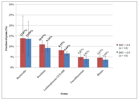 In both groups, Firmicutes, Bacteroidetes, and Proteobacteria proved to be the most common phyla (Figure 1). Firmicutes was represented with a higher fraction in the group with high IMT values, and Bacteroidetes in second place vice versa.