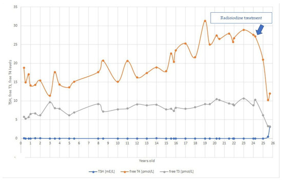 At the age of 20 years, his thyroid hormone level gradually increased and he was briefly commenced on thyrostatic therapy with methimazole 20 mg daily after the episode of weight loss and abdominal pain. No decline in thyroid hormone levels was observed after 1 month. Since the symptoms disappeared spontaneously, and he was not compliant to the treatment, methimazole was stopped. He reported no symptoms of hyperthyroidism, and there was no progression to overt hyperthyroidism in the next 3 years of follow-up. Physical examination showed mild tremor and sweating with a normal resting pulse and BMI (24 kg/m2). The thyroid gland volume was normal on clinical and ultrasound examination. However, at the cardiologic re-evaluation, his heart rate rose to 192 heartbeats per minute with ventricular extrasystoles during the cycle-ergometer exercise test. Echocardiogram showed no abnormalities and no signs of hypertension were found during 24-h ambulatory blood pressure monitoring. Treatment with radioiodine or total thyroidectomy was recommended. He agreed to radioiodine treatment. At the age of 25 years, he received 740 MBq 131-I with no complications. At the next appointment, lower thyroid hormone levels were observed—free T4 21 pmol/L, free T3 6.21 pmol/L, and TSH 0.01 mE/L. Four months after the treatment, he developed hypothyroidism with inadequate TSH level (free T4 10 pmol/L, free T3 3.3 pmol/L, and TSH 0.47 mE/L) and started treatment with levothyroxine (see Figure 1). He noticed some weight gain (2 kg) but otherwise reported no change in thyroid-related symptoms. Six months after radioiodine treatment while still hypothyroid despite taking 25 ug of levothyroxine, his TSH level was higher, yet inadequate, indicative of central hypothyroidism (TSH 3.10 mE/L, free T3 3.2 pmol/L (normal range: 4.1–6.7 pmol/L), and free T4 12.0 pmol/L (normal range: 13.4–21.3 pmol/L).