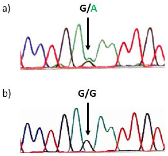 Novel TSHR gene variant NP_000360.2: p.Arg418Lys (NM_000369.2: c.1253G>A) in heterozygous state (a) and normal sequence (b).