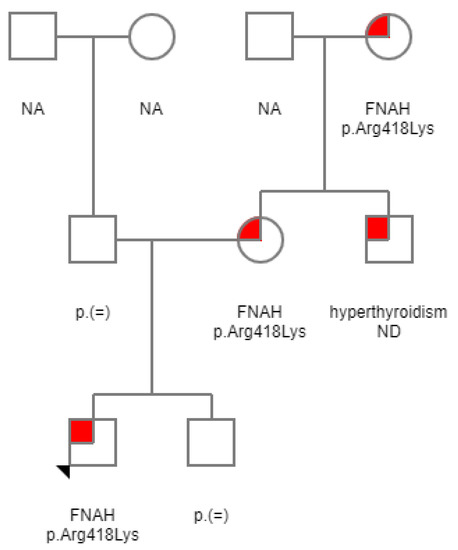 Family pedigree: family members with familial non-autoimmune autosomal dominant hyperthyroidism (FNAH) are indicated by red square; index patient is indicated by arrow. ND, not done; NA, not applicable.